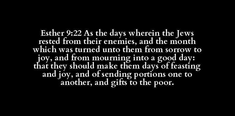 Esther 9:22 As the days wherein the Jews rested from their enemies, and the month which was turned unto them from sorrow to joy, and from mourning into a good day: that they should make them days of feasting and joy, and of sending portions one to another, and gifts to the poor.