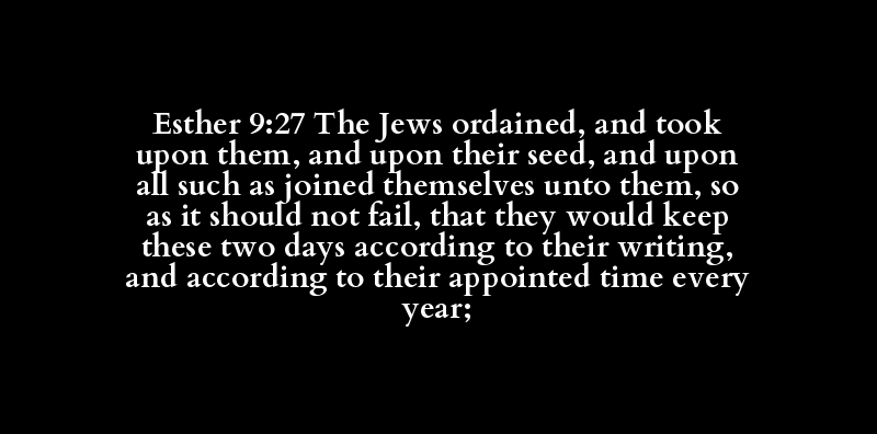 Esther 9:27 The Jews ordained, and took upon them, and upon their seed, and upon all such as joined themselves unto them, so as it should not fail, that they would keep these two days according to their writing, and according to their appointed time every year;