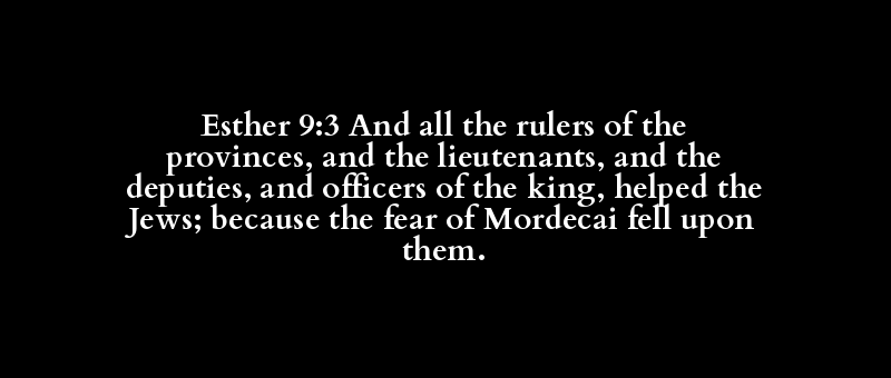 Esther 9:3 And all the rulers of the provinces, and the lieutenants, and the deputies, and officers of the king, helped the Jews; because the fear of Mordecai fell upon them.