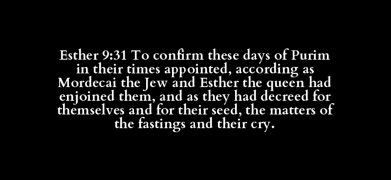 Esther 9:31 To confirm these days of Purim in their times appointed, according as Mordecai the Jew and Esther the queen had enjoined them, and as they had decreed for themselves and for their seed, the matters of the fastings and their cry.
