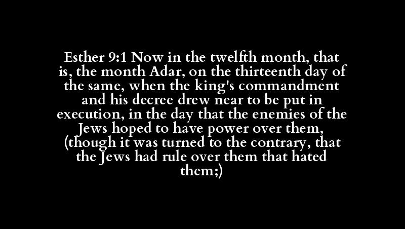 Esther 9:1 Now in the twelfth month, that is, the month Adar, on the thirteenth day of the same, when the king's commandment and his decree drew near to be put in execution, in the day that the enemies of the Jews hoped to have power over them, (though it was turned to the contrary, that the Jews had rule over them that hated them;)