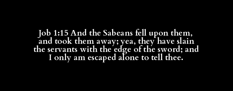 Job 1:15 And the Sabeans fell upon them, and took them away; yea, they have slain the servants with the edge of the sword; and I only am escaped alone to tell thee.