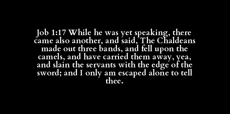 Job 1:17 While he was yet speaking, there came also another, and said, The Chaldeans made out three bands, and fell upon the camels, and have carried them away, yea, and slain the servants with the edge of the sword; and I only am escaped alone to tell thee.