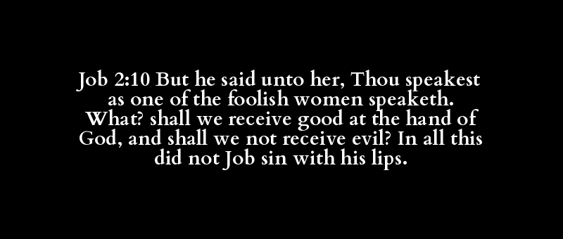 Job 2:10 But he said unto her, Thou speakest as one of the foolish women speaketh. What? shall we receive good at the hand of God, and shall we not receive evil? In all this did not Job sin with his lips.
