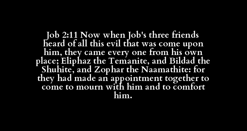 Job 2:11 Now when Job's three friends heard of all this evil that was come upon him, they came every one from his own place; Eliphaz the Temanite, and Bildad the Shuhite, and Zophar the Naamathite: for they had made an appointment together to come to mourn with him and to comfort him.