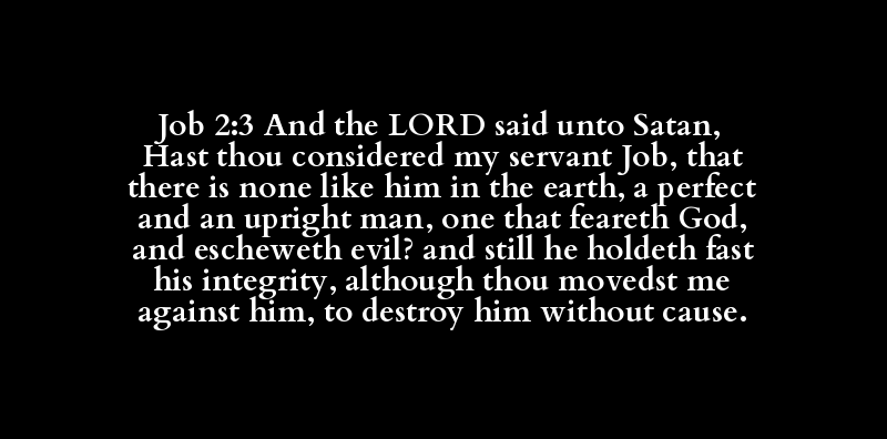 Job 2:3 And the LORD said unto Satan, Hast thou considered my servant Job, that there is none like him in the earth, a perfect and an upright man, one that feareth God, and escheweth evil? and still he holdeth fast his integrity, although thou movedst me against him, to destroy him without cause.