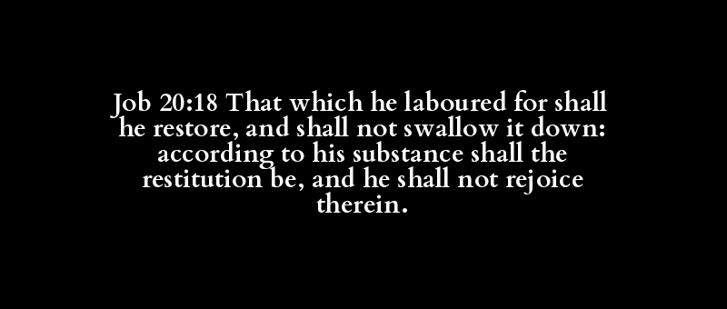 Job 20:18 That which he laboured for shall he restore, and shall not swallow it down: according to his substance shall the restitution be, and he shall not rejoice therein.