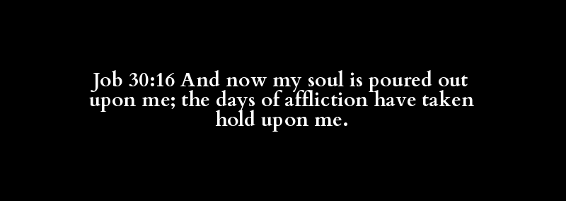 Job 30:16 And now my soul is poured out upon me; the days of affliction have taken hold upon me.