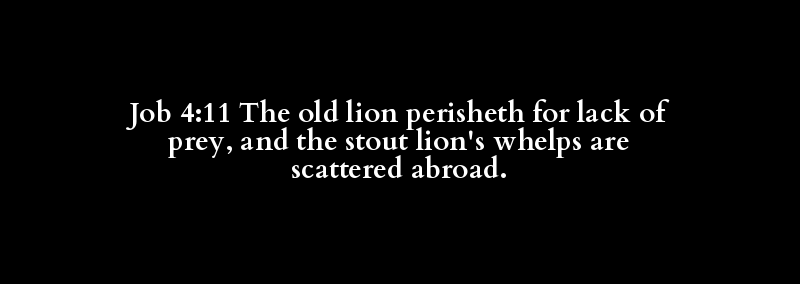 Job 4:11 The old lion perisheth for lack of prey, and the stout lion's whelps are scattered abroad.