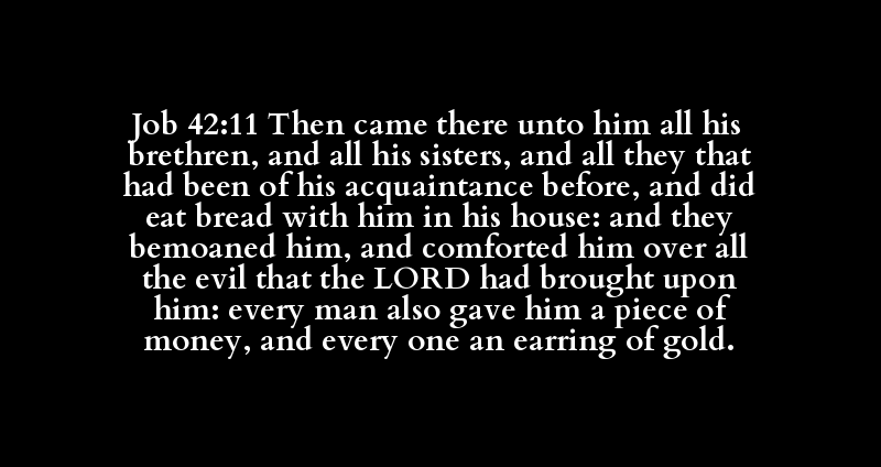 Job 42:11 Then came there unto him all his brethren, and all his sisters, and all they that had been of his acquaintance before, and did eat bread with him in his house: and they bemoaned him, and comforted him over all the evil that the LORD had brought upon him: every man also gave him a piece of money, and every one an earring of gold.