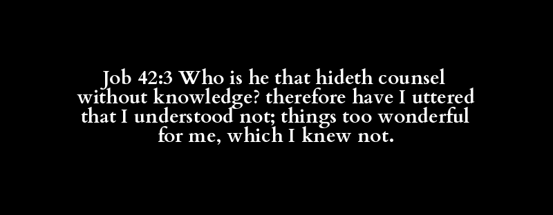 Job 42:3 Who is he that hideth counsel without knowledge? therefore have I uttered that I understood not; things too wonderful for me, which I knew not.