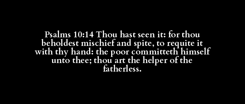 Psalms 10:14 Thou hast seen it: for thou beholdest mischief and spite, to requite it with thy hand: the poor committeth himself unto thee; thou art the helper of the fatherless.