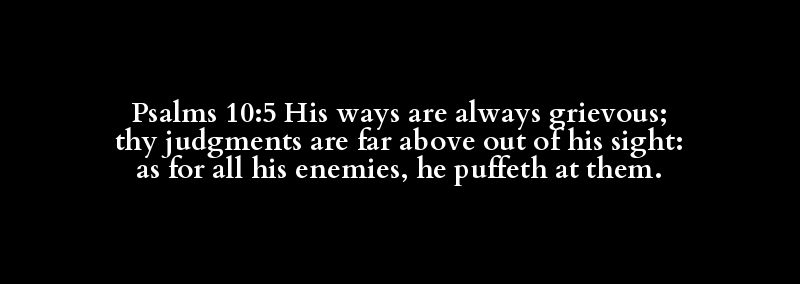 Psalms 10:5 His ways are always grievous; thy judgments are far above out of his sight: as for all his enemies, he puffeth at them.