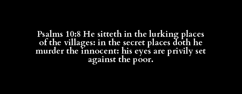 Psalms 10:8 He sitteth in the lurking places of the villages: in the secret places doth he murder the innocent: his eyes are privily set against the poor.
