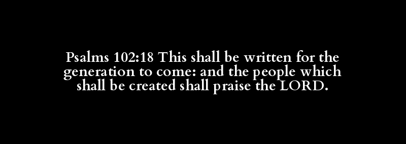 Psalms 102:18 This shall be written for the generation to come: and the people which shall be created shall praise the LORD.