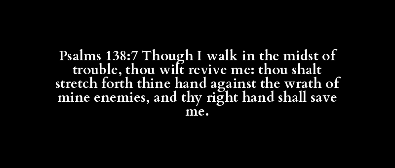 Psalms 138:7 Though I walk in the midst of trouble, thou wilt revive me: thou shalt stretch forth thine hand against the wrath of mine enemies, and thy right hand shall save me.