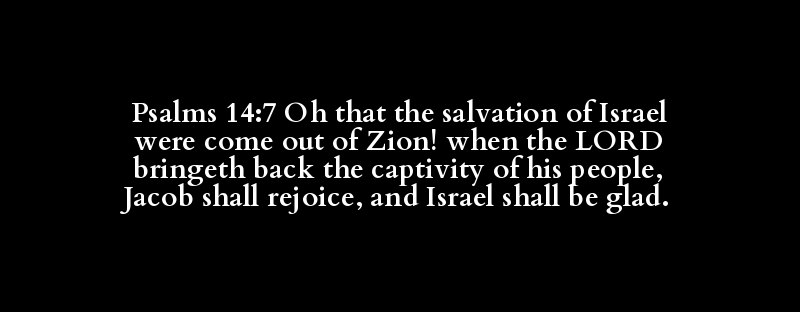 Psalms 14:7 Oh that the salvation of Israel were come out of Zion! when the LORD bringeth back the captivity of his people, Jacob shall rejoice, and Israel shall be glad.