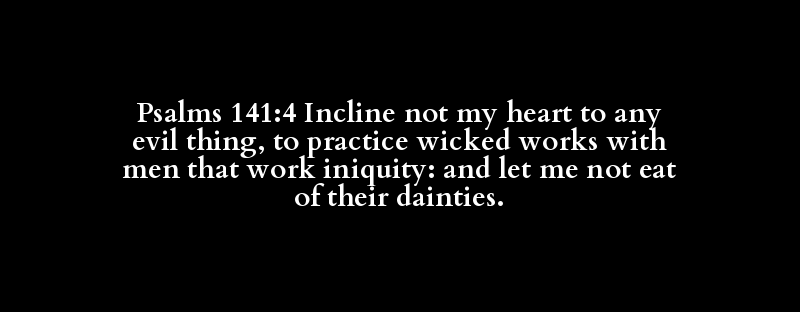 Psalms 141:4 Incline not my heart to any evil thing, to practice wicked works with men that work iniquity: and let me not eat of their dainties.