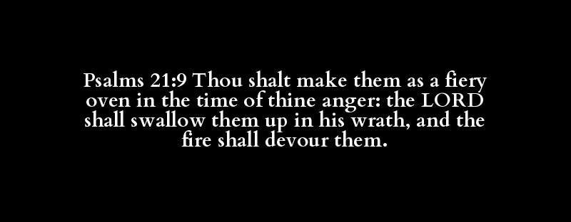 Psalms 21:9 Thou shalt make them as a fiery oven in the time of thine anger: the LORD shall swallow them up in his wrath, and the fire shall devour them.