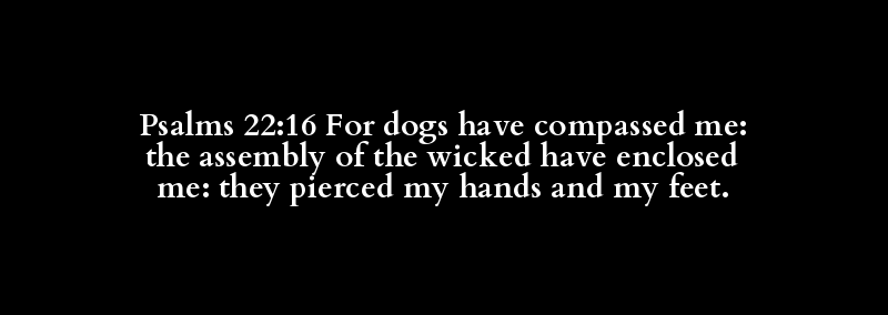 Psalms 22:16 For dogs have compassed me: the assembly of the wicked have enclosed me: they pierced my hands and my feet.