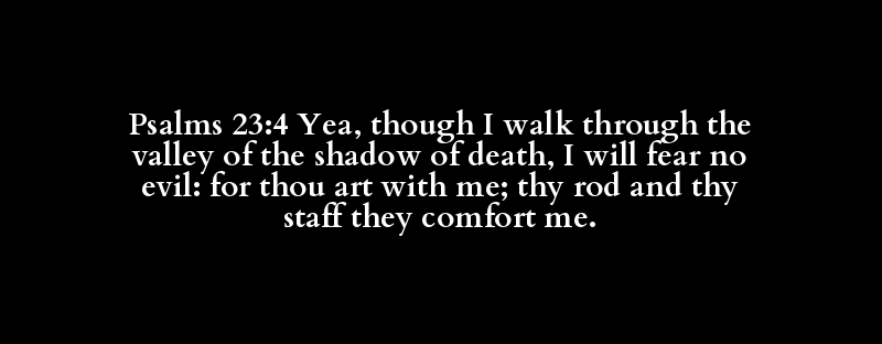 Psalms 23:4 Yea, though I walk through the valley of the shadow of death, I will fear no evil: for thou art with me; thy rod and thy staff they comfort me.