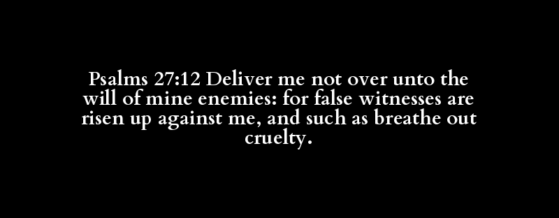 Psalms 27:12 Deliver me not over unto the will of mine enemies: for false witnesses are risen up against me, and such as breathe out cruelty.