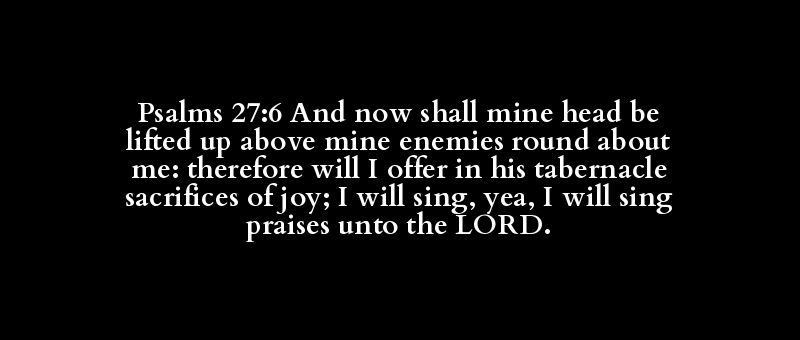 Psalms 27:6 And now shall mine head be lifted up above mine enemies round about me: therefore will I offer in his tabernacle sacrifices of joy; I will sing, yea, I will sing praises unto the LORD.