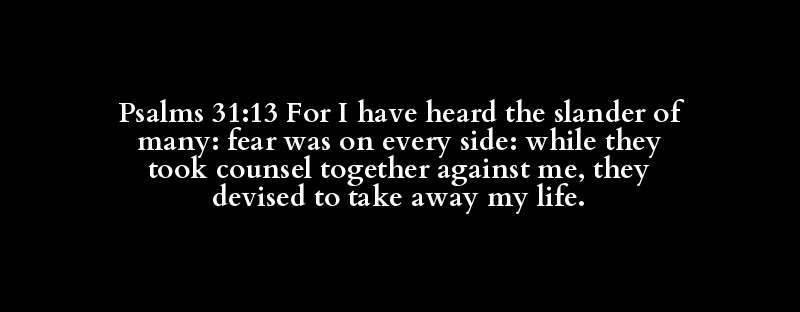 Psalms 31:13 For I have heard the slander of many: fear was on every side: while they took counsel together against me, they devised to take away my life.