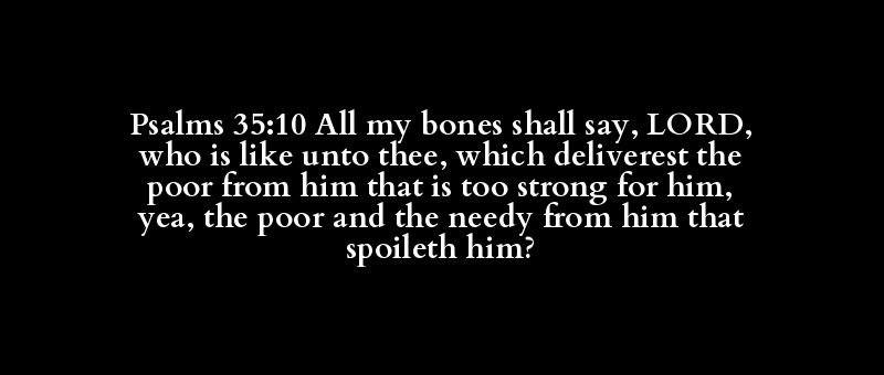 Psalms 35:10 All my bones shall say, LORD, who is like unto thee, which deliverest the poor from him that is too strong for him, yea, the poor and the needy from him that spoileth him?