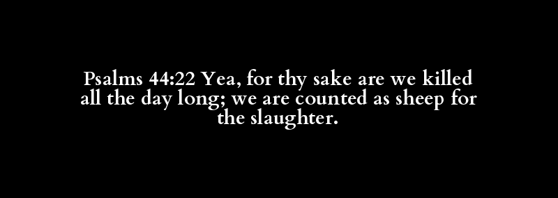 Psalms 44:22 Yea, for thy sake are we killed all the day long; we are counted as sheep for the slaughter.
