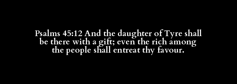 Psalms 45:12 And the daughter of Tyre shall be there with a gift; even the rich among the people shall entreat thy favour.