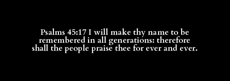 Psalms 45:17 I will make thy name to be remembered in all generations: therefore shall the people praise thee for ever and ever.