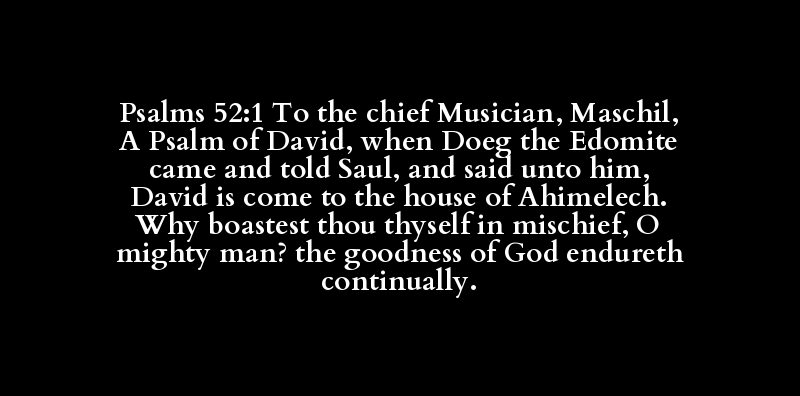 Psalms 52:1 To the chief Musician, Maschil, A Psalm of David, when Doeg the Edomite came and told Saul, and said unto him, David is come to the house of Ahimelech. Why boastest thou thyself in mischief, O mighty man? the goodness of God endureth continually.