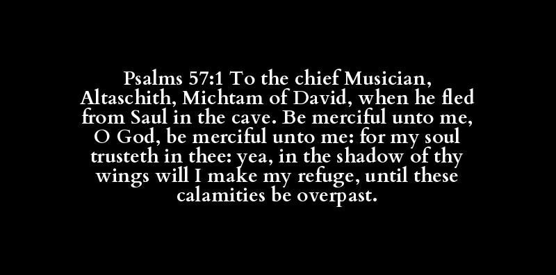 Psalms 57:1 To the chief Musician, Altaschith, Michtam of David, when he fled from Saul in the cave. Be merciful unto me, O God, be merciful unto me: for my soul trusteth in thee: yea, in the shadow of thy wings will I make my refuge, until these calamities be overpast.