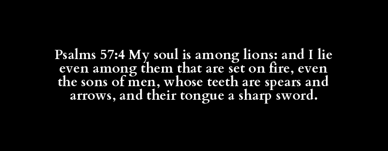 Psalms 57:4 My soul is among lions: and I lie even among them that are set on fire, even the sons of men, whose teeth are spears and arrows, and their tongue a sharp sword.