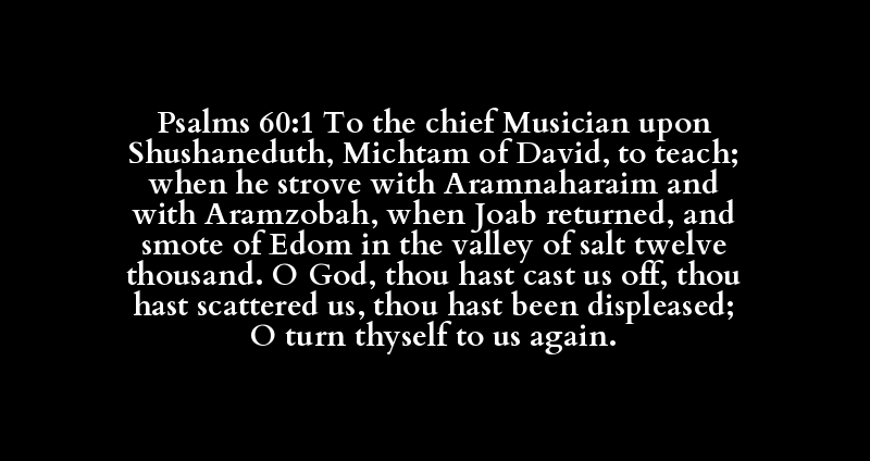 Psalms 60:1 To the chief Musician upon Shushaneduth, Michtam of David, to teach; when he strove with Aramnaharaim and with Aramzobah, when Joab returned, and smote of Edom in the valley of salt twelve thousand. O God, thou hast cast us off, thou hast scattered us, thou hast been displeased; O turn thyself to us again.