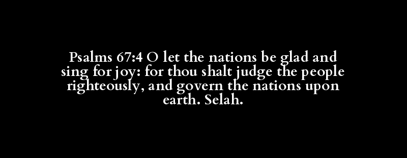 Psalms 67:4 O let the nations be glad and sing for joy: for thou shalt judge the people righteously, and govern the nations upon earth. Selah.