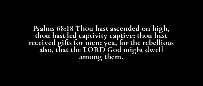 Psalms 68:18 Thou hast ascended on high, thou hast led captivity captive: thou hast received gifts for men; yea, for the rebellious also, that the LORD God might dwell among them.