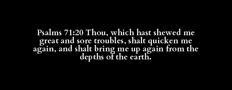 Psalms 71:20 Thou, which hast shewed me great and sore troubles, shalt quicken me again, and shalt bring me up again from the depths of the earth.