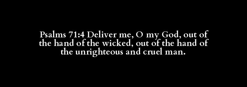 Psalms 71:4 Deliver me, O my God, out of the hand of the wicked, out of the hand of the unrighteous and cruel man.