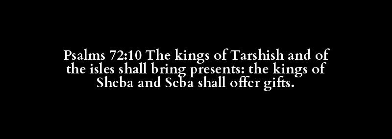 Psalms 72:10 The kings of Tarshish and of the isles shall bring presents: the kings of Sheba and Seba shall offer gifts.