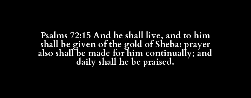 Psalms 72:15 And he shall live, and to him shall be given of the gold of Sheba: prayer also shall be made for him continually; and daily shall he be praised.