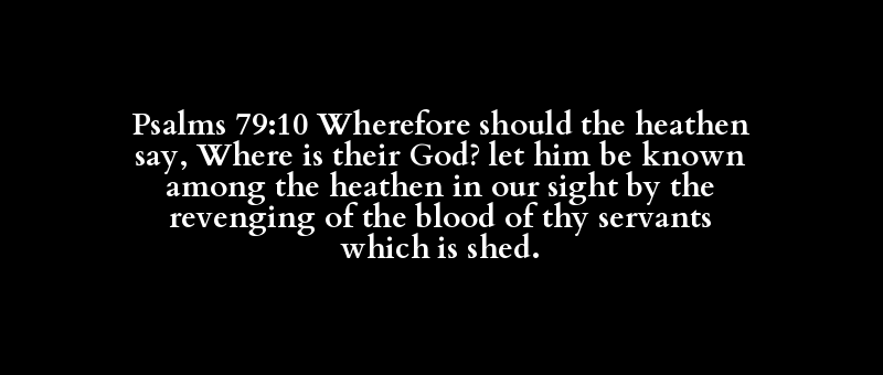 Psalms 79:10 Wherefore should the heathen say, Where is their God? let him be known among the heathen in our sight by the revenging of the blood of thy servants which is shed.