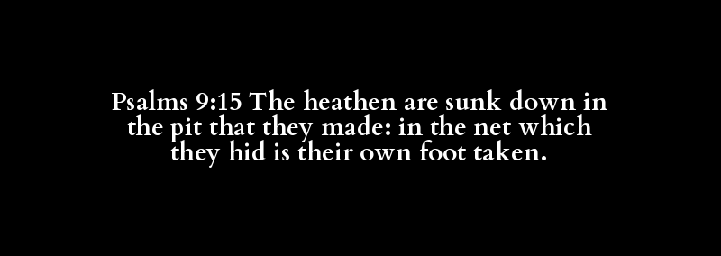 Psalms 9:15 The heathen are sunk down in the pit that they made: in the net which they hid is their own foot taken.