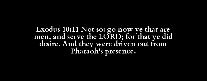 Exodus 10:11 Not so: go now ye that are men, and serve the LORD; for that ye did desire. And they were driven out from Pharaoh's presence.