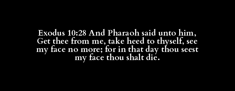 Exodus 10:28 And Pharaoh said unto him, Get thee from me, take heed to thyself, see my face no more; for in that day thou seest my face thou shalt die.