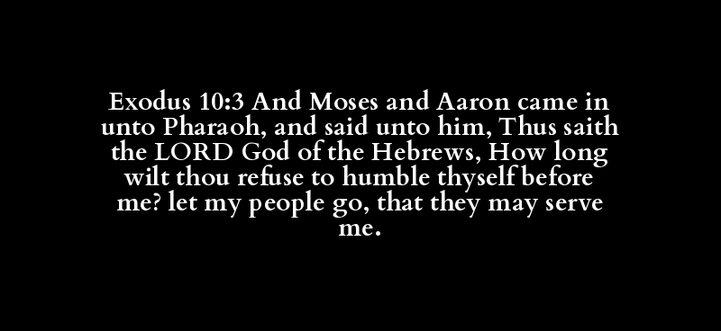 Exodus 10:3 And Moses and Aaron came in unto Pharaoh, and said unto him, Thus saith the LORD God of the Hebrews, How long wilt thou refuse to humble thyself before me? let my people go, that they may serve me.