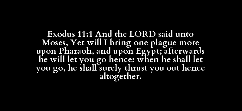 Exodus 11:1 And the LORD said unto Moses, Yet will I bring one plague more upon Pharaoh, and upon Egypt; afterwards he will let you go hence: when he shall let you go, he shall surely thrust you out hence altogether.