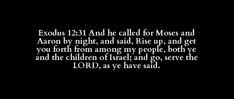 Exodus 12:31 And he called for Moses and Aaron by night, and said, Rise up, and get you forth from among my people, both ye and the children of Israel; and go, serve the LORD, as ye have said.