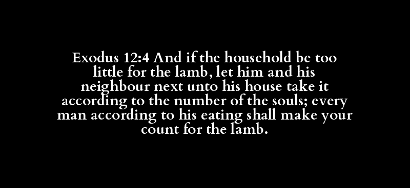 Exodus 12:4 And if the household be too little for the lamb, let him and his neighbour next unto his house take it according to the number of the souls; every man according to his eating shall make your count for the lamb.